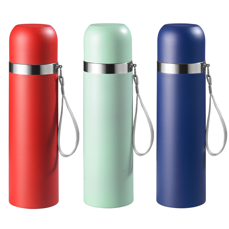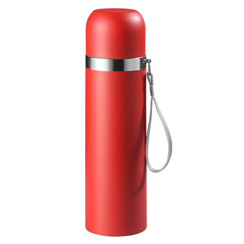 Der Thermoskolben. Seine Höhe beträgt 24 cm und sein Durchmesser 6,8 cm. Es hat einen rostfreien Stahlring um den Hals und einen grauen Tragband, der an der Seite befestigt ist. Der Thermoskolben ist ein übliches tägliches Produkt, mit dem Flüssigkeiten warm oder kalt bleiben.