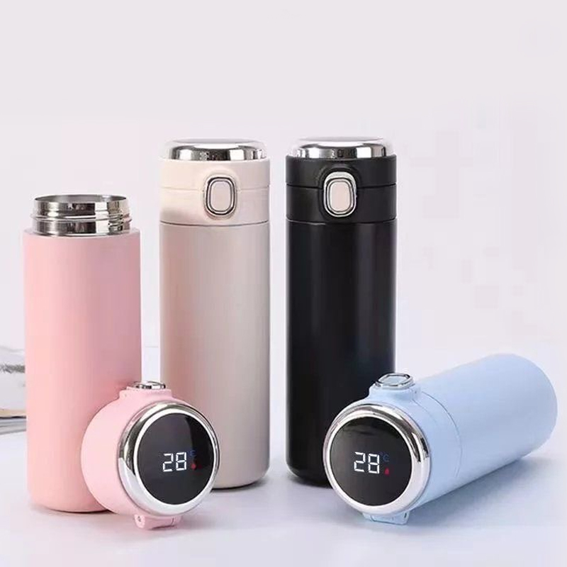 Diese Thermoskolben sind in verschiedenen charmanten Farben erhältlich, darunter hellblau, rosa, beige und schwarz. Eines ihrer herausragenden Merkmale ist das gebaute - in der Temperaturanzeige. Wie im Bild gezeigt, können Sie die Temperatur der Flüssigkeit im Inneren leicht überprüfen, wobei Messwerte wie 56 ° C und 28 ° C deutlich sichtbar sind.