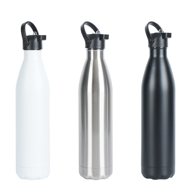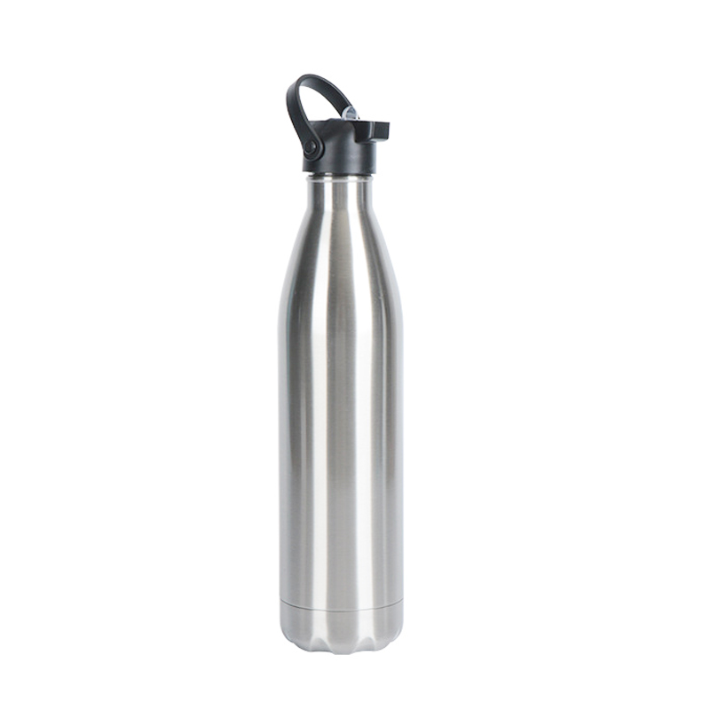Dies ist eine 750 ml Edelstahlwasserflasche. Es hat ein elegantes, metallisches Erscheinungsbild und einen schwarzen Griff für die Kappe zum einfachen Tragen, das für verschiedene Anlässe wie Outdoor -Aktivitäten oder tägliche Verwendung geeignet ist.